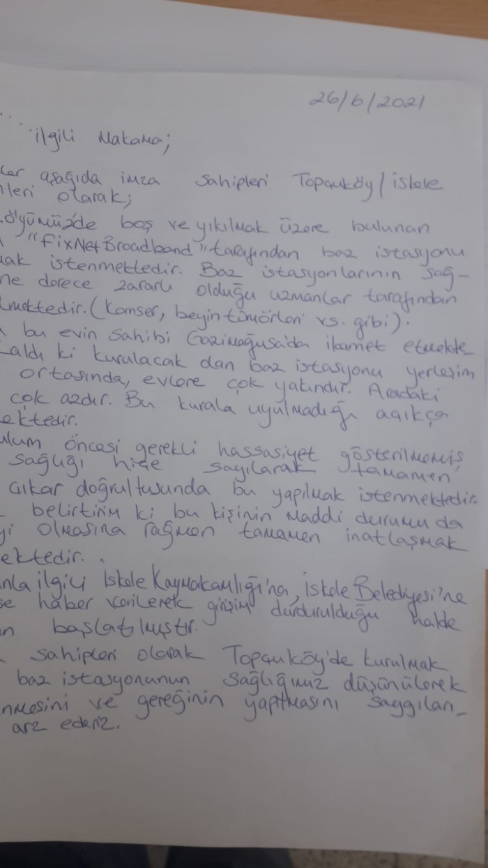 Köylerine Fixnet Broadband isimli internet şirketi tarafından kurulması planlanan baz istasyonunu istemeyen Topçuköy sainleri imza kampanyası başlatarak yardım çağrısı yaptı..