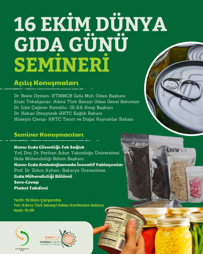 Kıbrıs Türk Sanayi Odası (KTSO) ile Gıda Mühendisleri Odası “Gıda Güvenliği-Tek Sağlık” ve “Gıda Ambalajlamada İnovatif Yaklaşımlar” başlıklı seminer düzenliyor.