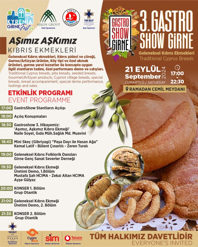 Girne Belediyesi, etkinlik kapsamında “Geleneksel Kıbrıs Ekmekleri” konseptiyle birbirinden özel lezzetlerin halk ile buluşacağını, Kıbrıs pidesi ve çöreği, Gurme/Artizan ürünler, köy tipi ve özel ekmek ürünleri, gurme yerel lezzetler ve konsepte uygun stantlar ile katılımcılara lezzet dolu anlar sunulacağını açıkladı.