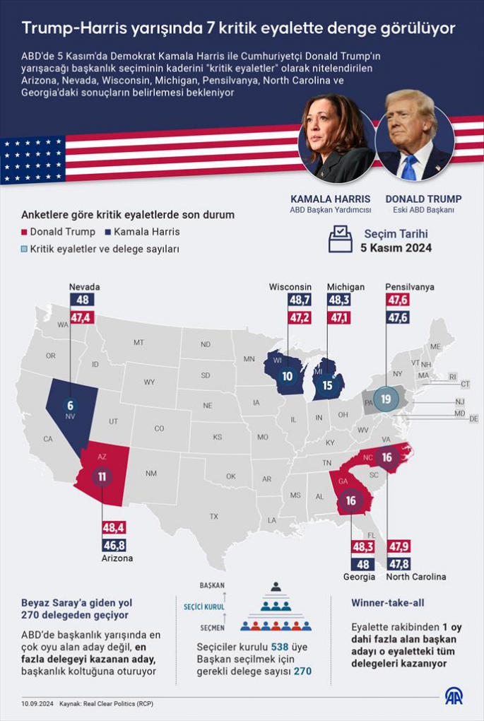 ABD'de 5 Kasım'da Demokrat Kamala Harris ile Cumhuriyetçi Donald Trump'ın yarışacağı başkanlık seçiminin kaderini "kritik eyaletler" olarak nitelendirilen Arizona, Nevada, Wisconsin, Michigan, Pensilvanya, North Carolina ve Georgia'daki sonuçların belirlemesi beklenirken, güncel anketlere göre bu eyaletlerdeki durum dengeli.