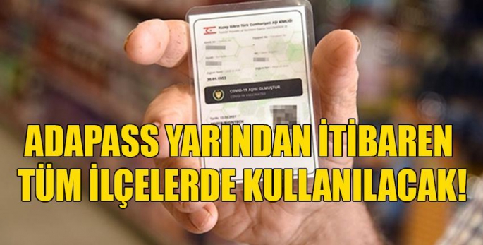 Bulaşıcı Hastalıklar Üst Komitesi’nin 1 Eylül’de aldığı karar doğrultusunda bazı mekan, sektör, aktivite ve etkinliklere girecek kişilerin test ve aşı durumlarının sorgulanabilmesi amacıyla pilot olarak 27 Ağustos’ta Lefkoşa sınırları içerisinde başlayan Adapass uygulaması, yarından itibaren tüm ilçelerde kullanılacak. Adapass sorgulaması, 18 yaş ve üzeri için zorunlu olacak.