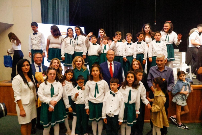 Cumhurbaşkanlığı’ndan yapılan açıklamaya göre, Cumhurbaşkanı Ersin Tatar’ın eşi Sibel Tatar öncülüğünde, fırsat eşitliği yaratmak amacıyla “özel” çocuklardan kurulan Cumhurbaşkanlığı Fidan Çocuk Korosu ve Orkestrası, KKTC Cumhurbaşkanlığı Senfoni Orkestrası ve Türk Maarif Koleji Ortaokul Korosu ile birlikte sahneye çıktı.