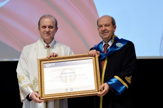 Cumhurbaşkanı Ersin Tatar’a, Karadeniz Teknik Üniversitesi’nde, uluslararası ilişkiler alanında fahri doktora tevdi edildi.
