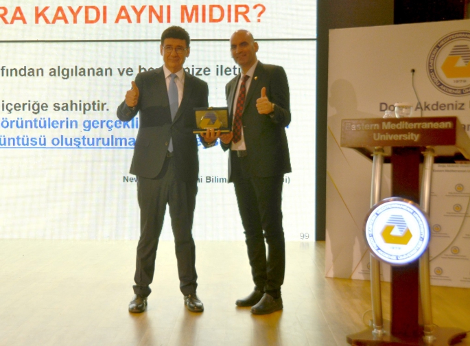 Etkinlik sonunda Rektör Yardımcısı Prof. Dr. Öztüren tarafından Beledioğlu’na DAÜ’ye özgü hediye takdim edildi.