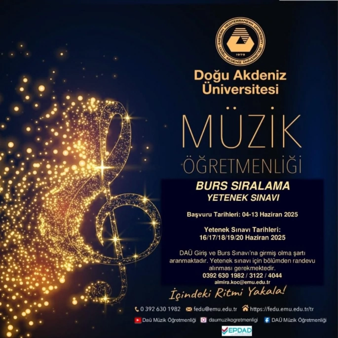 Doğu Akdeniz Üniversitesi (DAÜ) Eğitim Fakültesi, Güzel Sanatlar Eğitimi Bölümü tarafından Müzik Öğretmenliği Lisans Programı için 2025 – 2026 Akademik Yılı Güz Dönemi’ne yönelik “Burs Sıralama Yetenek Sınavı” yapılacağı bildirildi.