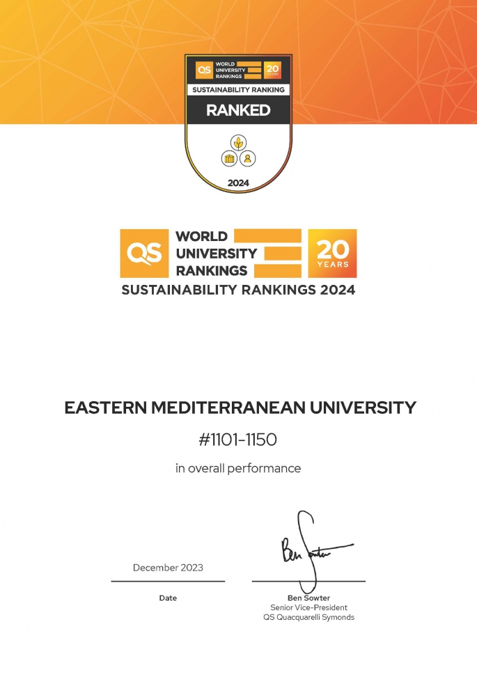 Doğu Akdeniz Üniversitesi (DAÜ), Quacquarelli Symonds (QS) Dünya Üniversiteler Sıralaması: Sürdürülebilirlik 2024 listesinde, Kuzey Kıbrıs Türk Cumhuriyeti’nden (KKTC) tek üniversite olarak yer aldı.