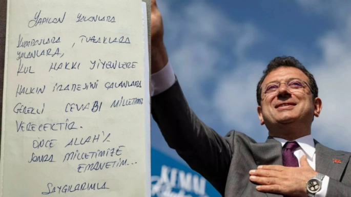Gözaltı kararının ardından İmamoğlu, sosyal medya hesaplarından el yazısıyla yazılmış bir not paylaşarak açıklamada bulundu. Notunda, "Yapılan yanlışlara, kumpaslara, tuzaklara, yalanlara, kul hakkı yiyenlere, halkın iradesini çalanlara gerekli cevabı milletimiz verecektir" ifadelerine yer verdi.