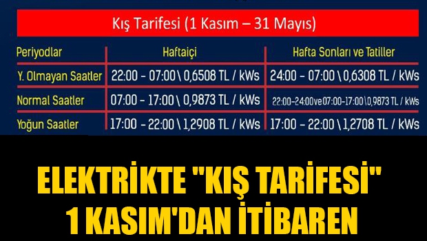 Kış tarifesinde, hafta içi yoğun olmayan saatler 22.00’den 07.00’ye kadar olacak. Bu zaman diliminde kilowatt saate 0,6508 TL ödenecek.