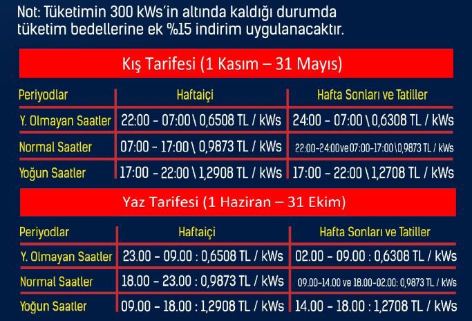 Hafta sonu 24.00’den 07.00’ye kadar olacak yoğun olmayan saatlerin kilowatt saatinin ücreti ise 0,6308 TL.