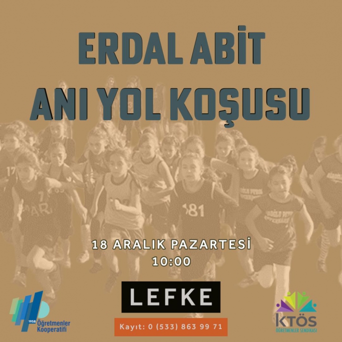 Kıbrıs Türk Öğretmenler Sendikası’nın ilkokullar arası tasarladığı sportif, sanatsal ve kültürel etkinlikler çerçevesinde düzenlenecek Erdal Abit Anı Yol Koşusu bu yıl 18 Aralık tarihinde Lefke'de yapılacak. Okulların 6 kişiden oluşan takımlarla katılacağı koşu 18 Aralık Pazartesi sabah saat 10.00’da başlayacak.