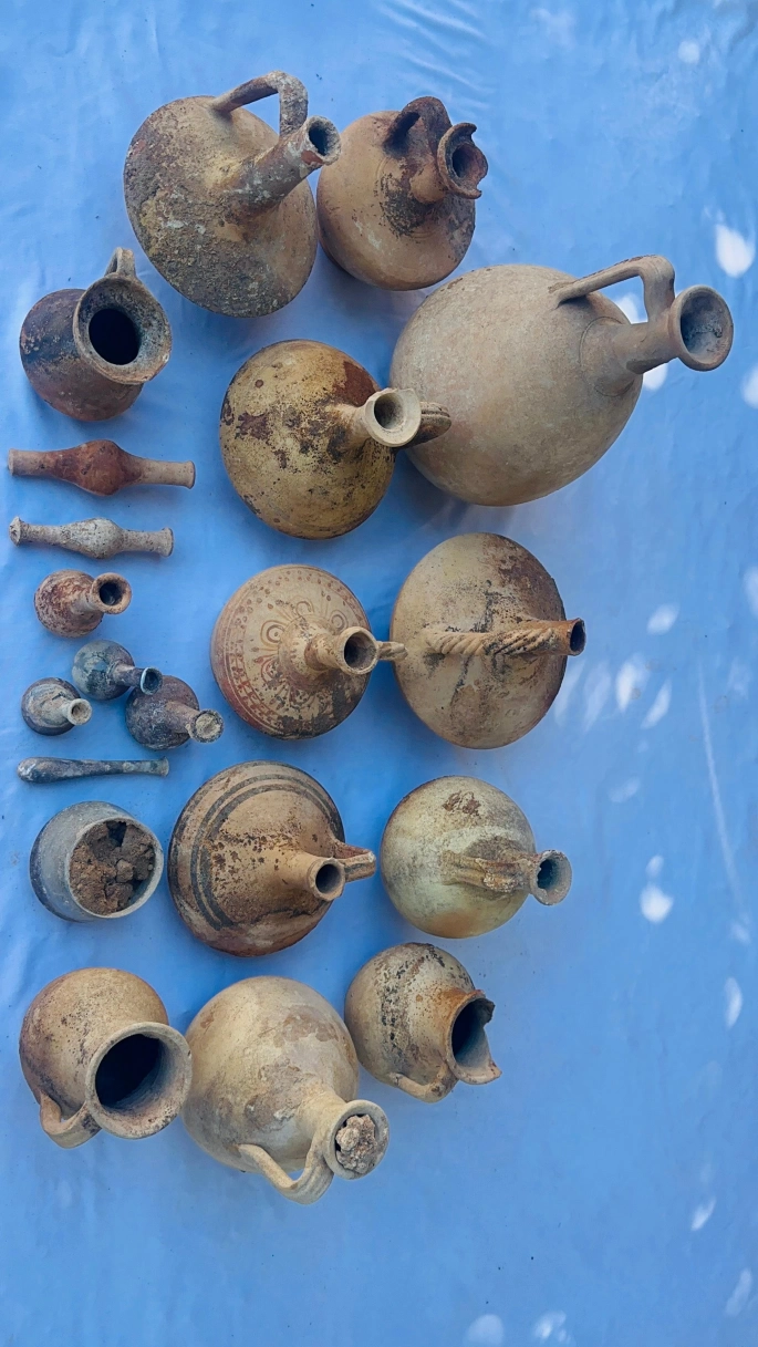Kazılarda; pişmiş toprak kase, kandil, lagynos, unguentariumlar, çeşitli çanak çömlekler, cam unguentarium, tunç sikke ve iğne parçaları ile altın yapraklara rastlandı. Ayrıca mezar içerisinde insana ait kemik kalıntıları da gün yüzüne çıkarıldı.