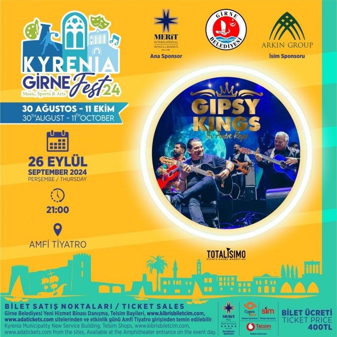 “Bamboleo”, “Djobi Djoba” ve “Baila Baila” gibi şarkıları ile hafızalara kazınan Gipsy Kings by Andre Reyes için biletler www.girnebelediyesi.com adresinden, tüm Telsim Shoplar’dan, Girne Belediyesi Yeni Hizmet Binası’ndan (danışma) veya konser günü kapıdan temin edilebilecek.