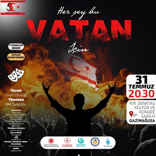 Kıbrıs Barış Harekatı’nın 50’nci yılı dolayısıyla, TC Lefkoşa Büyükelçiliği himayelerinde TC Gençlik ve Spor Bakanlığı, Lefkoşa Yunus Emre Enstitüsü ve Damla Derneği iş birliklerinde “Her Şey Bu Vatan İçin” adlı tiyatro oyunu sahnelenecek.