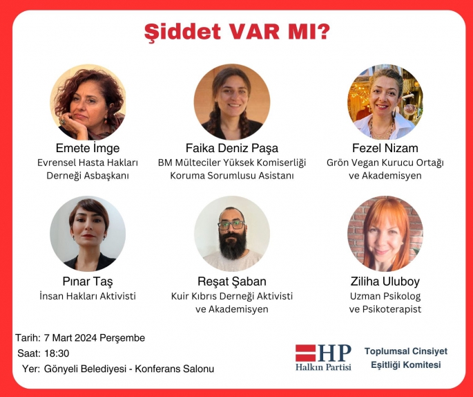 "Şiddet VAR MI?” isimli panele konuşmacı olarak, Emete İmge (Evrensel Hasta Hakları Derneği Asbaşkanı), Faika Deniz Paşa (Birleşmiş Milletler Mülteciler Yüksek Komiserliği Koruma Sorumlusu Asistanı), Fezel Nizam (Grön Vegan Kurucu Ortağı ve Akademisyen ), Pınar Taş (İnsan Hakları Aktivisti), Reşat Şaban (Kuir Kıbrıs Derneği Aktivisti ve Akademisyen) ve Ziliha Uluboy (Uzman Psikolog ve Psikoterapist) katılacak. Panelde toplumsal cinsiyet temelli şiddet olmak üzere, hayvanlara, mültecilere ve çevreye uygulanan şiddetin yanında sağlıkta şiddet irdelenecek.