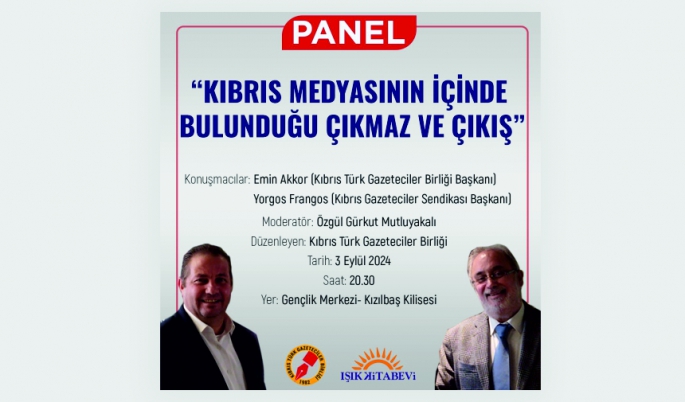 Panelde Kıbrıs Türk Gazeteciler Birliği Başkanı Emin Akkor ile Kıbrıs Gazeteciler Sendikası Başkanı Yorgos Frangos, medyanın içinde bulunduğu çıkmaza dikkat çekip çıkış yollarıyla ilgili önerilerini sunacak.