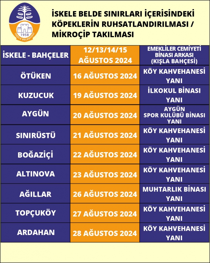 İşlem, açıklanan program uyarınca İskele ve köylerinde 12 Ağustos ile 11 Eylül arasında 09.00-12.00 saatleri arasında veteriner kontrolünde yapılacak.