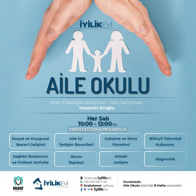 İyilik Evi’nden yapılan açıklamaya göre, Uzman Psikolojik Danışman-Aile Danışmanı Yasemin Eroğlu rehberliğinde verilecek eğitimlerde, sosyal ve duygusal becerilerin geliştirilmesi ve aile içi iletişim, çatışma yönetimi konuları ele alınacak ve sağlıklı bireyler yetiştirmenin sırları üzerinde durulacak.