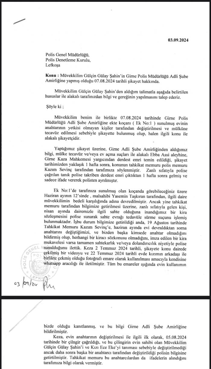 Eke, evi aldığı Yasemin Taşkıran’ın daha önce emlakçılık yaptığını ve toplu mesajlar göndererek evi başkalarına satılık olarak duyurduğunu da ifade ediyor. Evinin gasp edilmesiyle ilgili tüm yasal işlemleri gerçekleştirdiğini ve avukatla birlikte Lefkoşa’da polise dilekçeler verdiğini belirten Eke, mağduriyetinin giderilmesini talep ediyor.