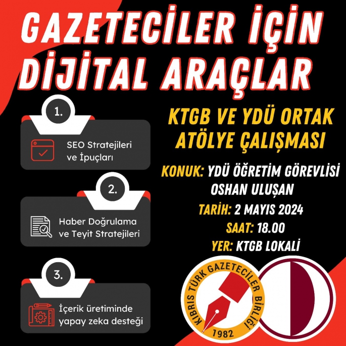 Bazı üniversitelerle iş birliği içinde hazırlanan etkinlikler çerçevesinde yarın “Gazeteciler İçin Dijital Araçlar… Stratejileri ve İpuçları, Haber Doğrulama ve Teyit Stratejileri, İçerik Üretiminde Yapay Zeka Desteği” konulu atölye çalışması yapılacak.