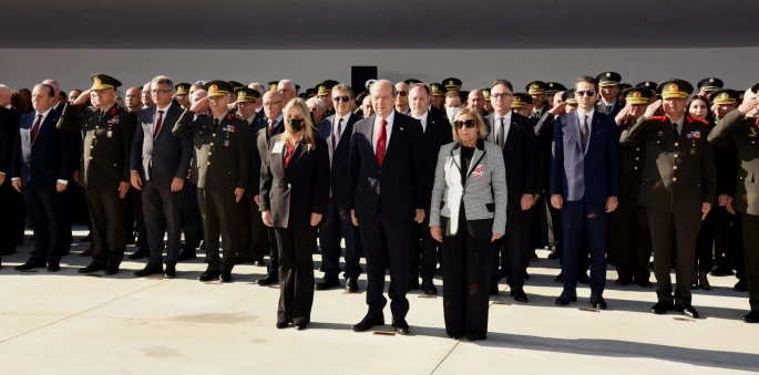 Cumhurbaşkanı Ersin Tatar ve Denktaş’ın ailesinin çelenkleri anıta sunmasıyla başlayan törende, saygı duruşunun ardından İstiklal Marşı eşliğinde bayraklar göndere çekilerek yarıya indirildi.