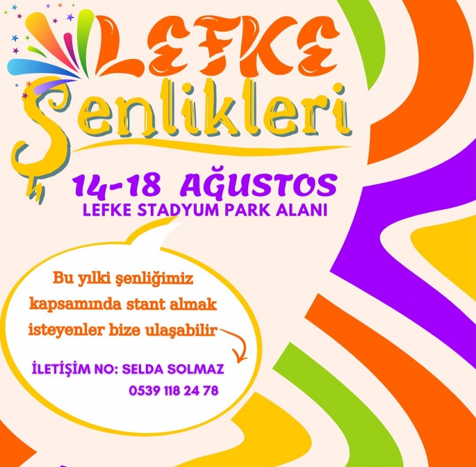 Lefke Belediyesi’nden verilen bilgiye göre, 14-18 Ağustos tarihleri arasında Lefke Stadyumu Park alanında yapılacak şenlikler kapsamında stand kiralamak isteyenler 0539 118 24 78 numaralı telefondan belediyeyle iletişime geçebilecek.