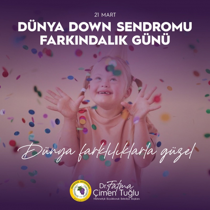 Mehmetçik Büyükkonuk Belediye Başkanı Dr. Fatma Çimen Tuğlu, 21 Mart Dünya Down Sendromu Farkındalık Günü dolayısıyla yayımladığı mesajda, Down Sendromlu bireylerin yeteneklerini keşfetme ve desteklemenin toplumu daha adil yapacağını söyledi.