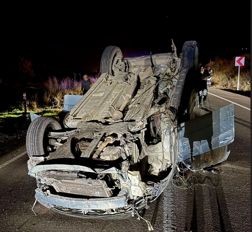 Çarpmanın etkisiyle kontrolsüzce savrulan araç, yolda takla atarak tavanı üzerinde durdu.