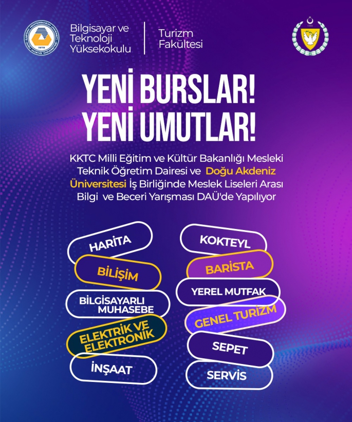 Doğu Akdeniz Üniversitesi (DAÜ), Milli Eğitim Bakanlığı’na bağlı Mesleki Teknik Öğretim Dairesi iş birliğinde “Meslek Liseleri Arası Bilgi ve Beceri Yarışmalarına” ev sahipliği yapacak.