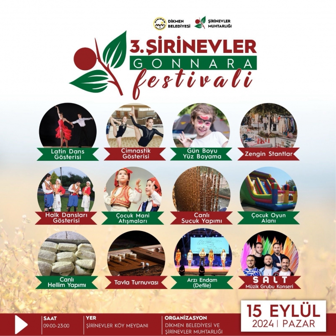 Dikmen Belediyesi ile Şirinevler Muhtarlığı iş birliğinde düzenlenen festival, Şirinevler köy meydanında 09.00-23.00 saatleri arasında yapılacak.