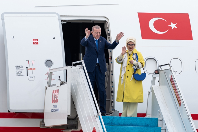 Cumhurbaşkanı Erdoğan'a eşi Emine Erdoğan, Türkiye Aile ve Sosyal Hizmetler Bakanı Mahinur Özdemir Göktaş, Dışişleri Bakanı Hakan Fidan, Enerji ve Tabii Kaynaklar Bakanı Alparslan Bayraktar, Hazine ve Maliye Bakanı Mehmet Şimşek, Sanayi ve Teknoloji Bakanı Mehmet Fatih Kacır, Ticaret Bakanı Ömer Bolat, Milli İstihbarat Teşkilatı (MİT) Başkanı İbrahim Kalın, Cumhurbaşkanlığı İletişim Başkanı Fahrettin Altun, Cumhurbaşkanı Dış Politika ve Güvenlik Başdanışmanı Akif Çağatay Kılıç ve bazı yetkililer eşlik etti.
