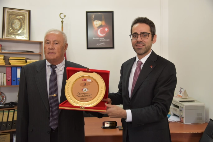 TBK Gaziler Derneği Başkanı Nusrettin Yuca ziyaret anısına Büyükelçi Serim’e plaket takdim etti.