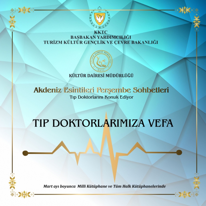 Başbakan Yardımcılığı, Turizm, Kültür, Gençlik ve Çevre Bakanlığı’na bağlı Kültür Dairesi’nin kütüphaneleri uğrak yeri haline getirme hedefiyle 2022 yılının haziran ayında başlattığı Akdeniz Esintileri Perşembe Sohbetleri mart ayında tıp doktorlarını konuk ediyor.