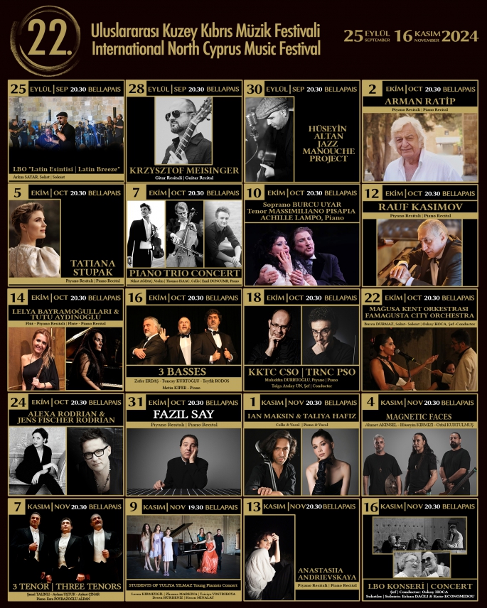 Kıbrıs, Türkiye, Rusya, Ukrayna, Belarus, Amerika, Almanya, İngiltere, İtalya, Fransa, İsviçre, Polonya, Tataristan ve Azerbaycan'dan yüzlerce sanatçının yer alacağı 22. Uluslararası Kuzey Kıbrıs Müzik Festivali'nin programı ise şöyle: