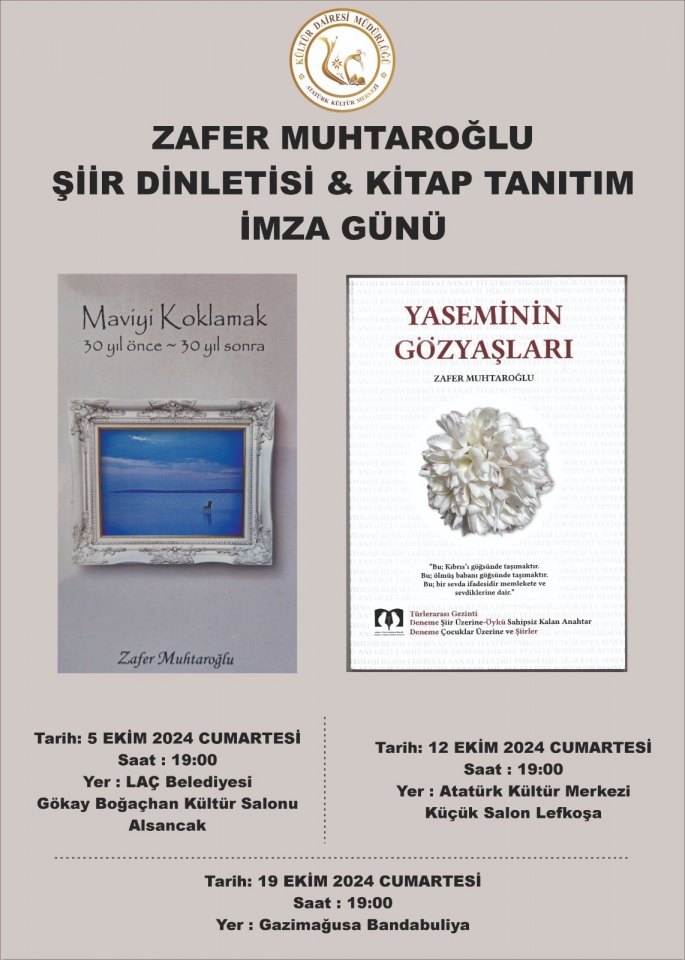 5 Ekim’de Alsancak'ta LAÇ Belediyesi Gökay Boğaçhan Kültür Salonu’nda; 12 Ekim’de Lefkoşa AKM küçük salonda, 19 Ekim'de ise Gazimağusa Bandabuliya’da şiir dinletisi, kitap tanıtımı ve imza günü etkinlikleri yapılacak.